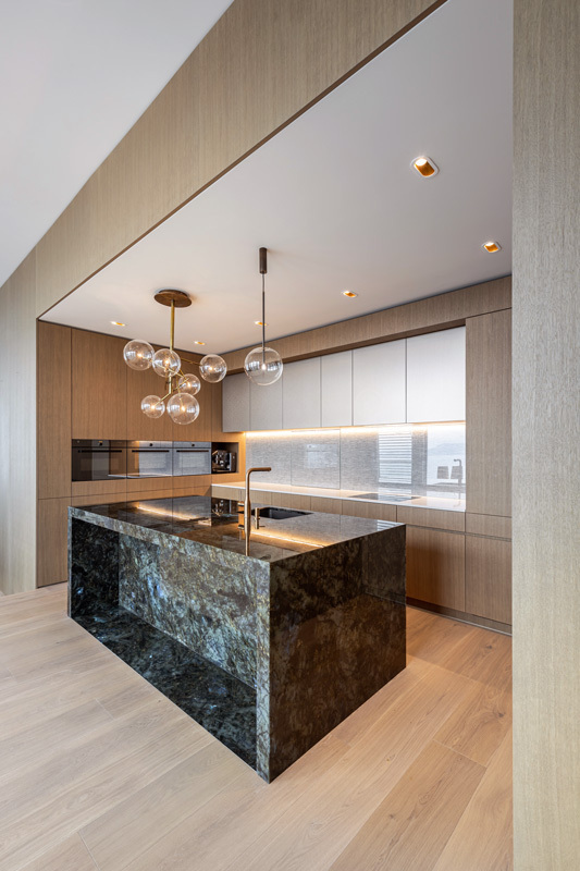 In close collaboration with the interior designer, Stuber Team implemented the vision of the client from France. The granite forms the center. Around it, space unfolds, life emerges. Depending on the incidence of light, the polished Labrador Madagascar creates a prismatic interplay of its colors and radiates an immense amount of warmth. Throughout the apartment, it sets important accents. And literally stands in natural contrast to the wood.
