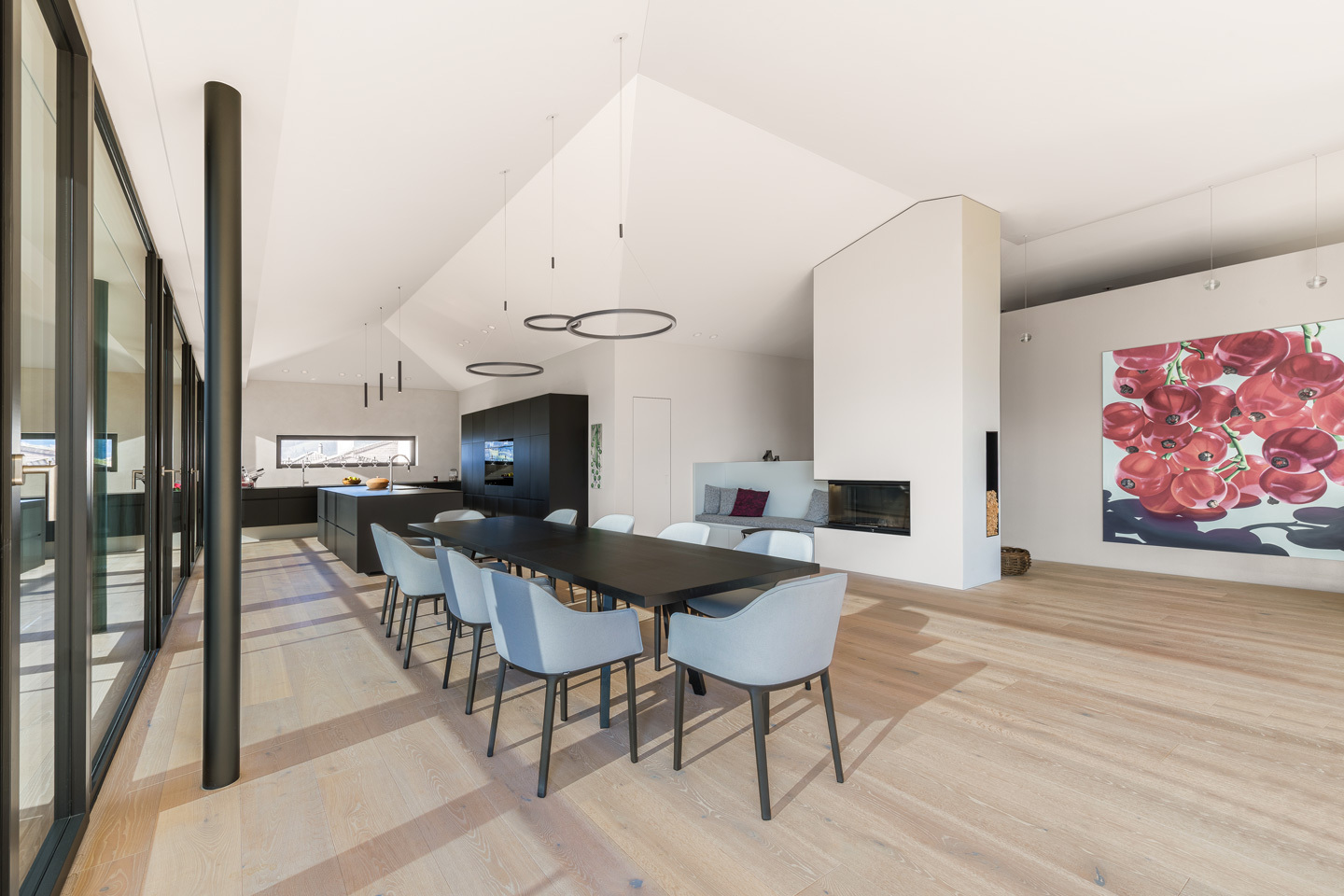 In this radical conversion project, Stuber Team developed a consistent de-sign concept in close cooperation with the married couple who own the home and the architect. This most definitely makes the kitchen, the room that is the focal point of the home, the starting point. From here, the distinc-tive look is transported into the other rooms and adapted to the different architectural conditions.