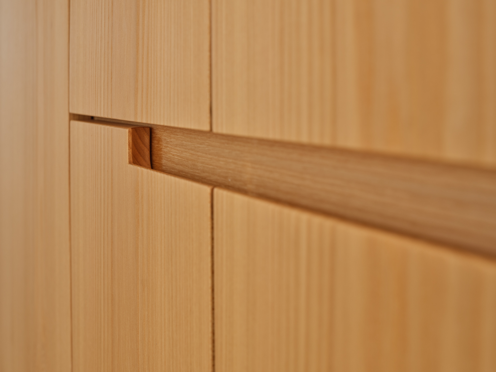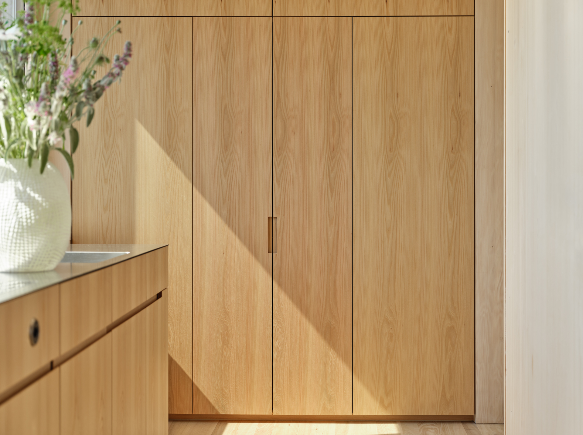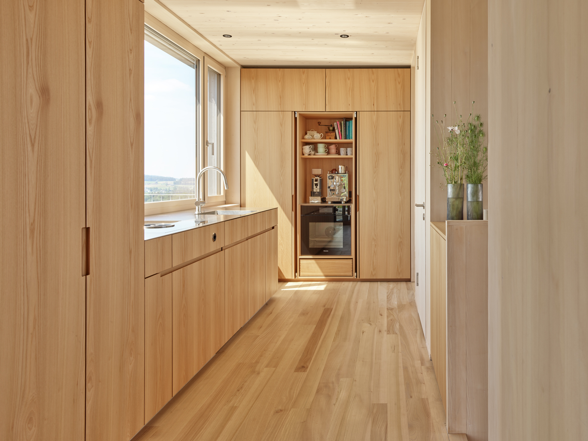 Fichte Mondholz wurde im ganzen Haus mit dem Nachhaltigkeitsgedanken eingesetzt und in der Küche mit dem Schweizer Holz Ulme ergänzt. So entstand eine warme Materialkombination, welche das Gesamtbild prägt und den roten Faden vom ganzen Haus aufnimmt.