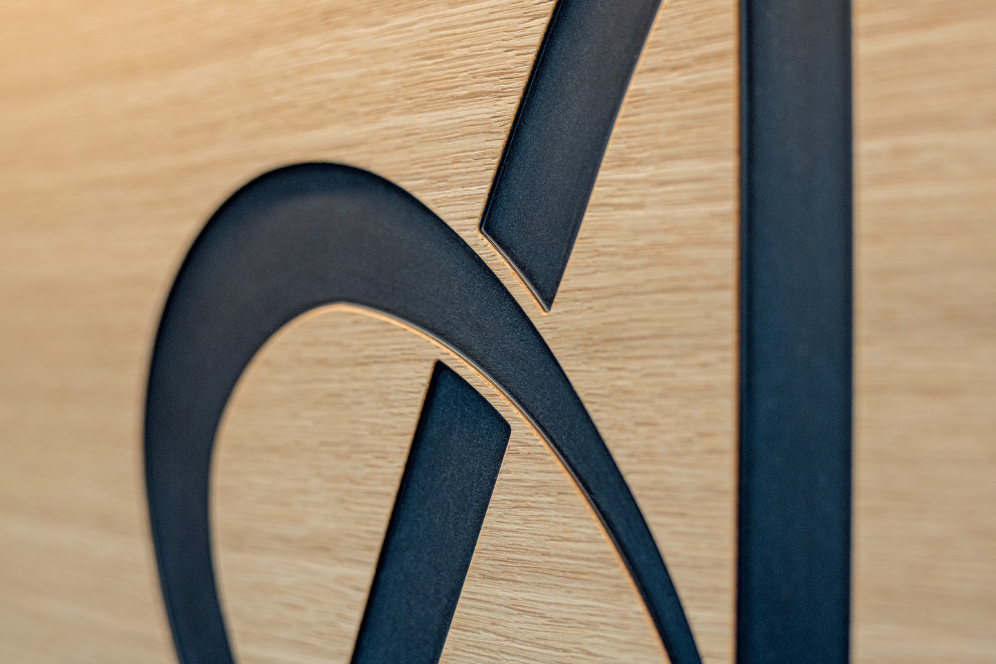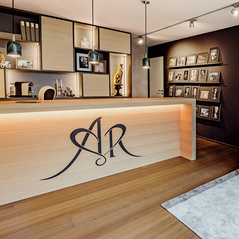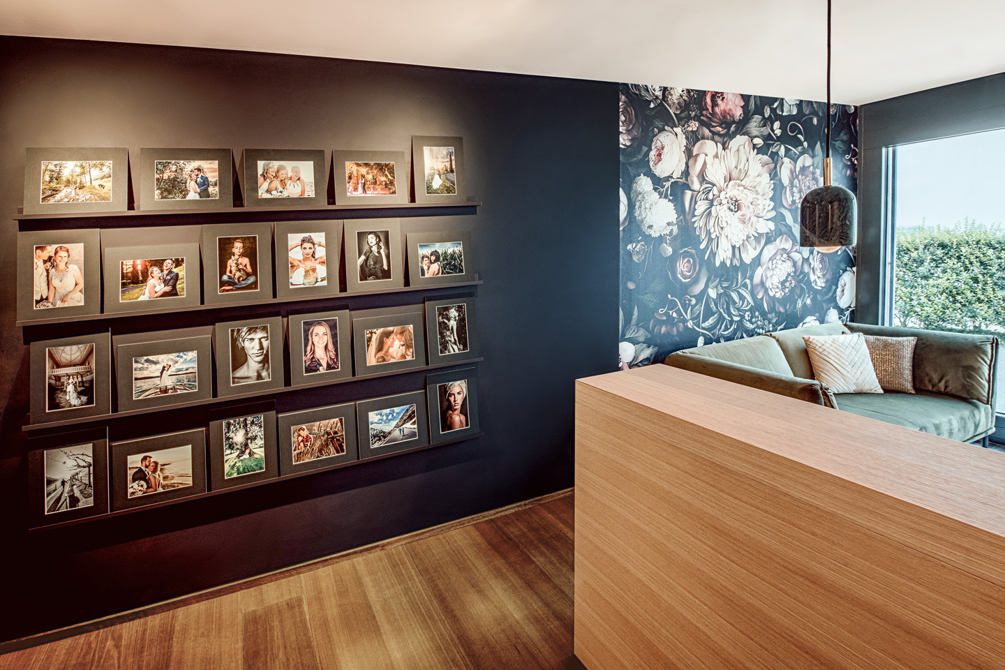 Viel helles Holz öffnet den Raum und schafft eine Wohlfühlatmosphäre, um Kunden zu empfangen aber auch um kreativ zu arbeiten. Der fliessende Übergang vom produktiven Arbeiten zum Kundenempfang gelingt mit der Empfangstheke mühelos. Als kleines Highlight hat Stuber Team das Logo der Hochzeitsfotografin in eine furnierte schwarze Holzfaserplatte gefräst. Für einen Arbeitsraum mit unverwechselbarer Persönlichkeit.