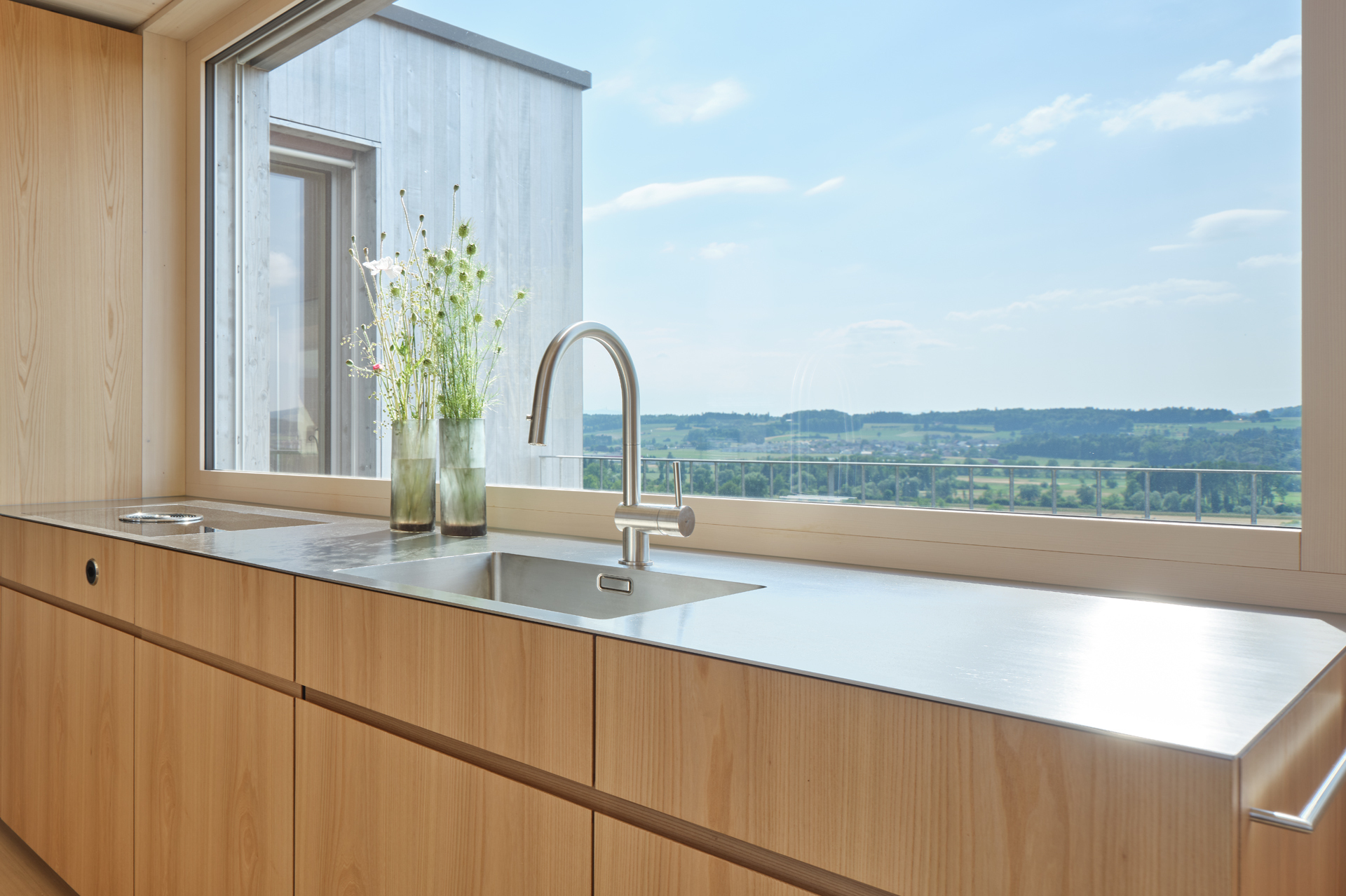 Beim Kochen in die Ferne schweifen und den wunderschönen Ausblick geniessen oder nachts den Mond beobachten. Der Mond, der für die Küche wie auch für das ganze Haus eine besondere Bedeutung hat.