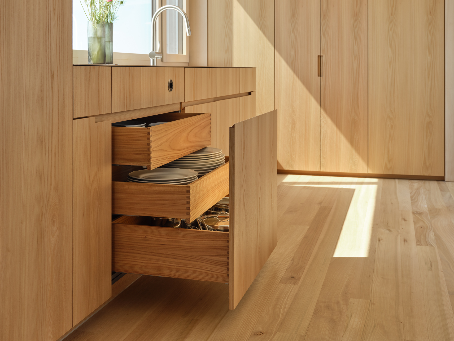 Die eingesetzten Massivholzschubladen ergeben mit dem graphit grauen Schrankinneren einen schönen Kontrast und die Eingriffprofile sowie die Edelstahlplatte als Abdeckung runden das schlichte und reduzierte Design der Küche ab.