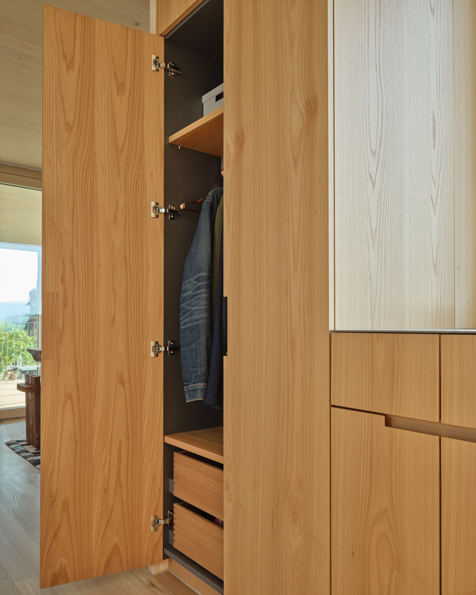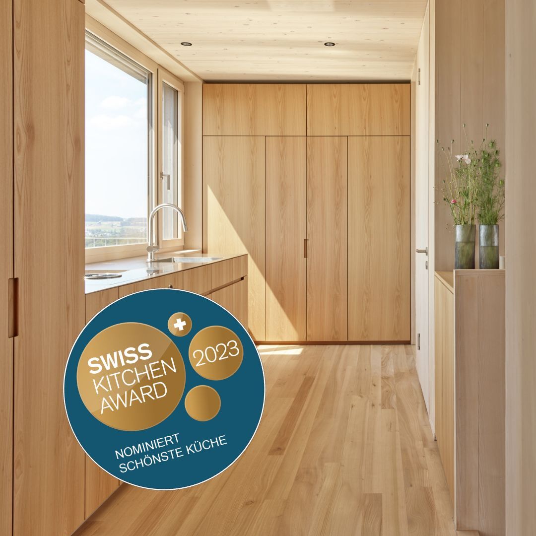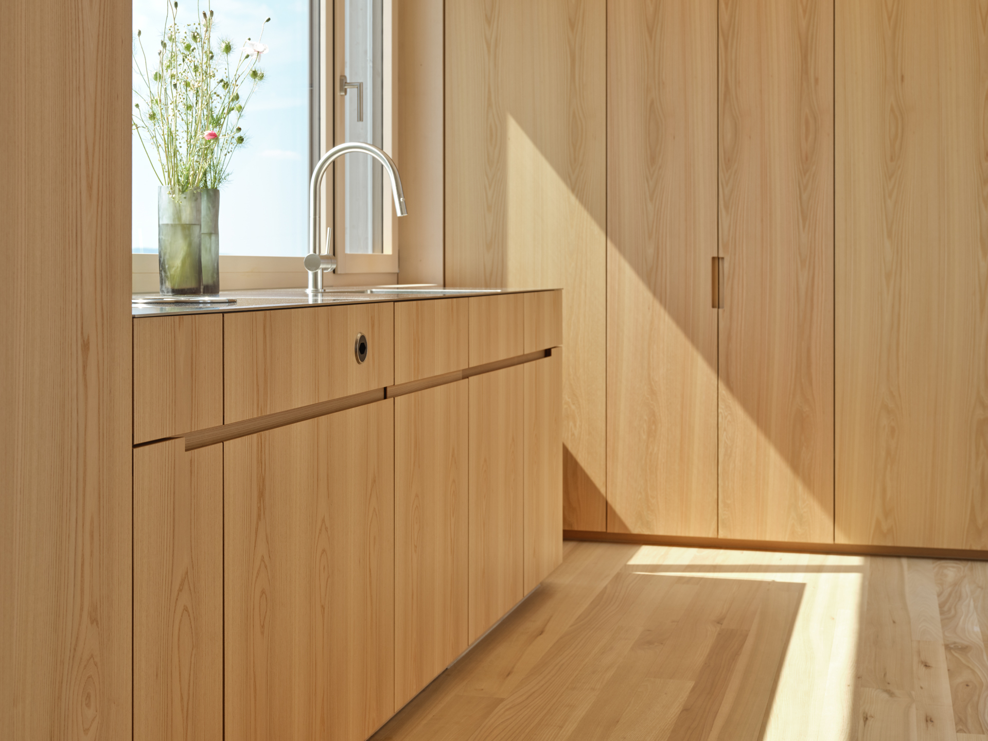 Fichte Mondholz wurde im ganzen Haus mit dem Nachhaltigkeitsgedanken eingesetzt und in der Küche mit dem Schweizer Holz Ulme ergänzt. So entstand eine warme Materialkombination, welche das Gesamtbild prägt und den roten Faden vom ganzen Haus aufnimmt.