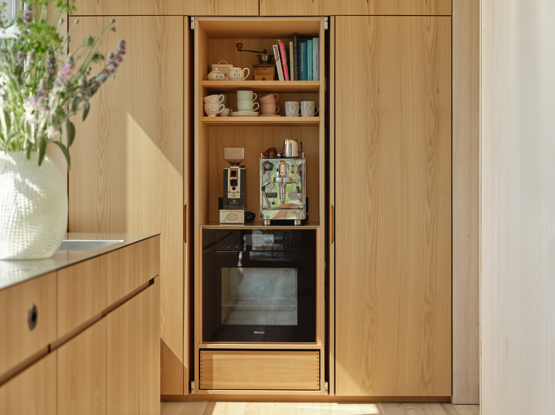 Durch die beschränkten Platzverhältnisse galt es eine minimalistische Küche zu planen, an der es aber an nichts fehlen sollte. So wurde in einem Schrank mit Einschubfronten Platz für den Backofen sowie eine zusätzlich Ablage- und Arbeitsfläche geschaffen.